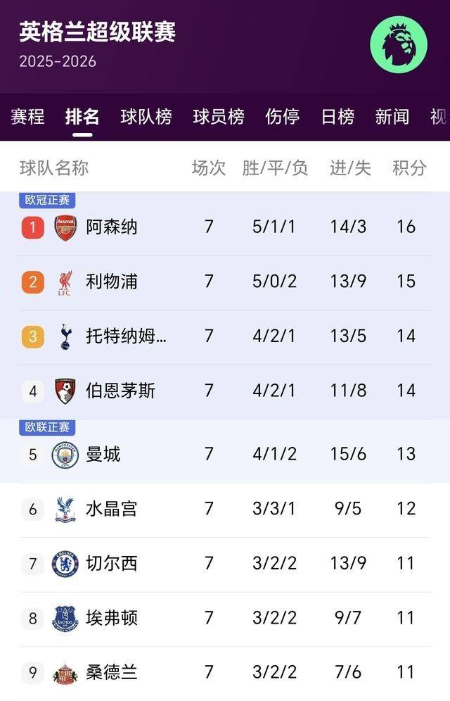 英超直播,英超赛程,英超积分榜,英超比分预测,曼联利物浦直播/覆盖2025年英超联赛所有比赛,提供免费高清中文直播入口、最新赛程安排、实时积分榜、比分预测与波胆分析,聚焦曼联、利物浦、曼城、阿森纳等豪门动态。英超联赛第七轮的尘埃落定,几场扣人心弦的较量不仅点燃了赛场激情,更深刻地搅动了积分榜的格局。曼城在客场以一球小胜布伦特福德,纽卡斯尔联则在主场干净利落地击败了诺丁汉森林。与此同时,水晶宫在古迪逊公园球场与埃弗顿的比赛中惜败,结束了他们本赛季开局的不败神话。本轮战罢,利物浦与曼城双双以18分的积分并列榜首,阿森纳紧随其后,积分榜前列的排名发生了显著洗牌,而积分榜下游的球队也开始感受到日益严峻的保级压力。
