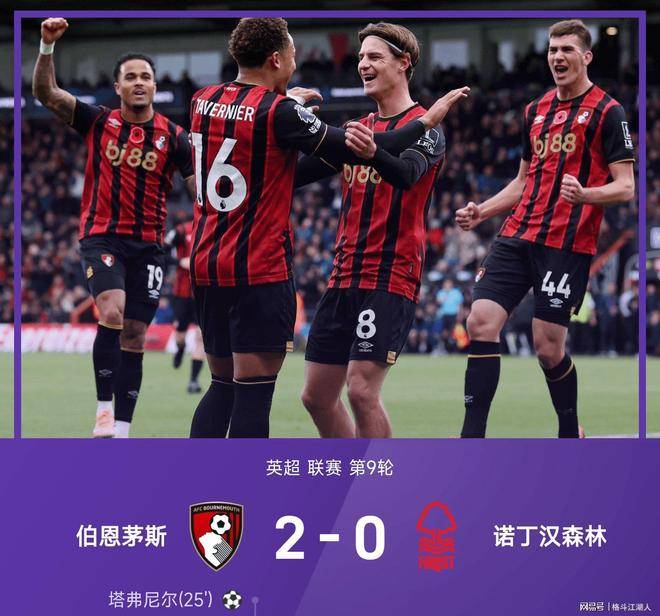 伯恩茅斯在赛前排位第4,成为本赛季英超的一匹黑马。诺丁汉森林则深陷困境,已经更换了两名主教练。尽管上轮欧联杯以2-0战胜波尔图,但他们的联赛表现仍不见起色。比赛的上半场,伯恩茅斯便迅速取得2-0的领先。第25分钟,塔弗尼尔开出的角球直接入网,伯恩茅斯首开纪录。紧接着,第40分钟,伯恩茅斯在中场抢断后,克鲁皮在距离球门较远的位置发起远射,球应声入网,伯恩茅斯以2-0领先。此后,尽管双方互有攻守,但伯恩茅斯保持住了领先优势,将2-0的比分保持到了终场,最终全取三分,排名升至第二。