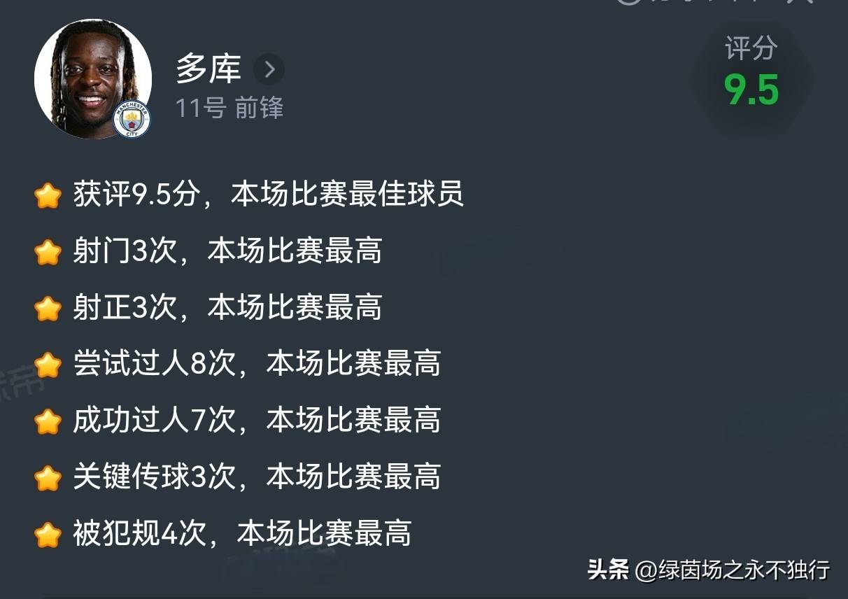 第62分钟,本场发挥出色的多库横向带球后轰入世界波,曼城3-0锁定胜局。