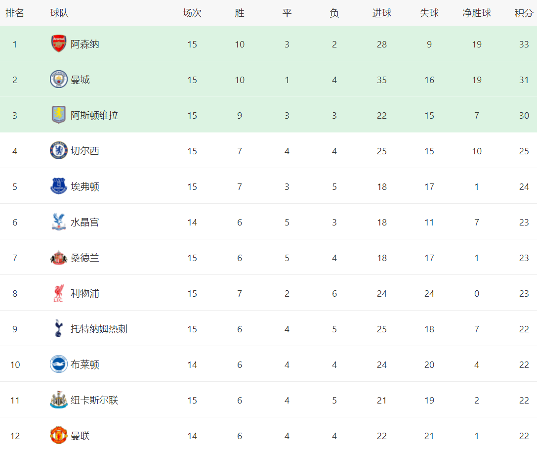 在积分榜上,阿森纳总积分依然是33分,排名榜首,但是优势已经所剩无几了。曼城赢球之后,总积分达到31分,排名第2,只比阿森纳少2分。阿斯顿维拉30分排名第3。第4的是切尔西,拿到25分。埃弗顿24分排名第5。水晶宫、桑德兰和利物浦都是23分。返回搜狐,查看更多