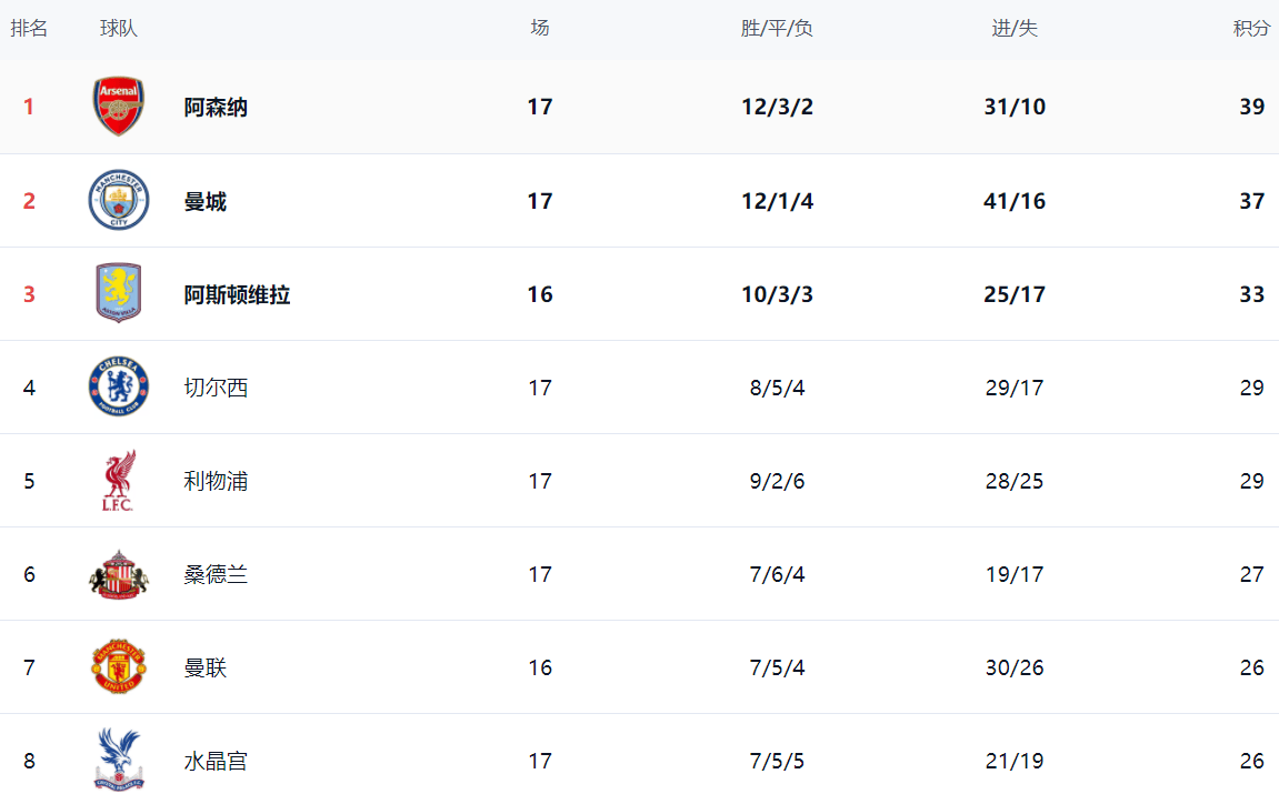 在积分榜上,阿森纳以39分排名榜首。曼城拿到37分,以2分的劣势排名第2。第3的是阿斯顿维拉,拿到33分。不过,阿斯顿维拉少赛一场。切尔西以29分排名第4。利物浦赢球之后,总积分也达到29分,升到了第5名,距离欧冠区只有一步之遥。桑德兰27分排名第6。曼联26分排名第7。水晶宫也是26分,排名第8。热刺只拿到22分,排名第13。返回搜狐,查看更多