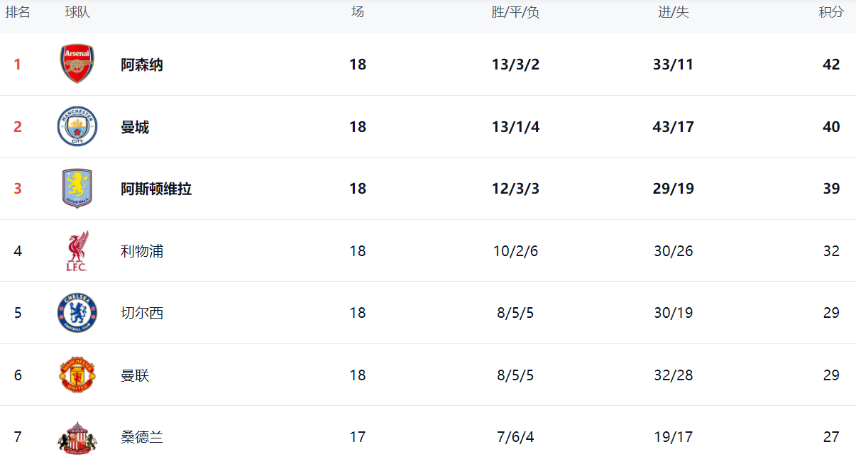 在积分榜上,阿森纳以42分高居榜首。曼城紧随其后,拿到40分。阿斯顿维拉继续高歌猛进,拿到39分,排名第3。利物浦赢球之后,总积分达到32分,超越切尔西升到第4名。切尔西依然是29分,掉到第5名。而曼联也是29分,排名第6。返回搜狐,查看更多