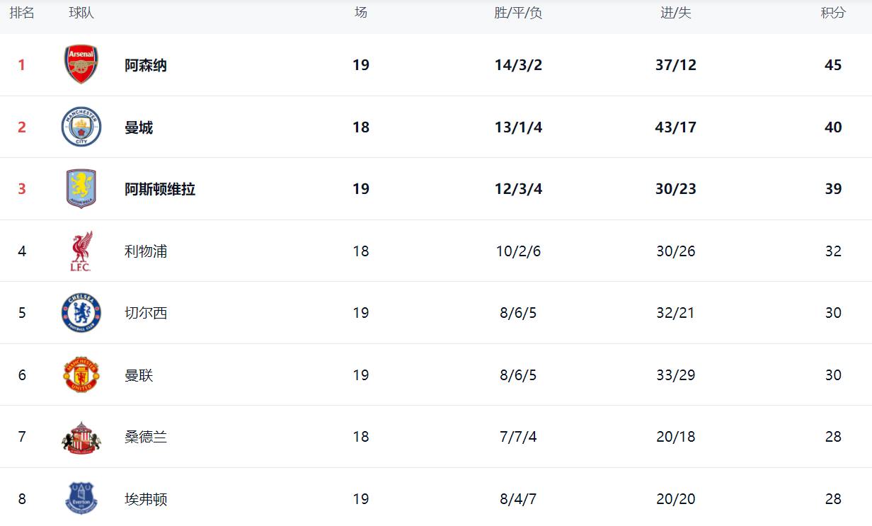 在积分榜上,阿森纳总积分达到45分,排名第1。曼城以40分排名第2,落后了5分。不过,曼城少赛一场。阿斯顿维拉依然是39分,排名第3,争冠形势恶化了。利物浦以32分排名第4。第5的是切尔西,拿到30分。曼联也是30分,排名第6。桑德兰和埃弗顿都是28分。纽卡斯尔联只拿到26分,排名第10。热刺只有25分,排名第13。返回搜狐,查看更多