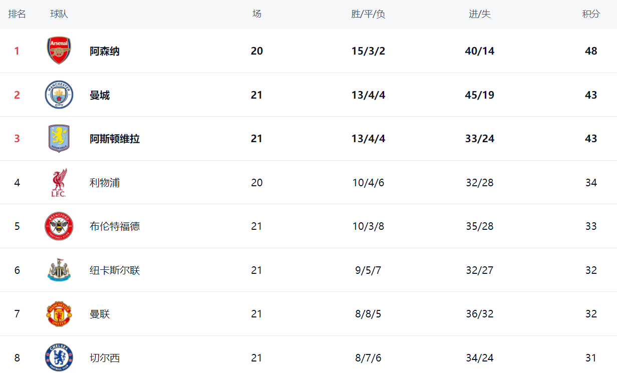 在积分榜上,曼联和阿斯顿维拉纷纷丢分,让阿森纳赚大了。阿森纳总积分是48分。曼城和阿斯顿维拉都是43分。阿森纳领先5分,而且还是少赛一场。如果阿森纳接下来能够击败利物浦,将把优势扩大到8分。利物浦目前34分,排名第4。布伦特福德以33分排名第5。纽卡斯尔联和曼联都是32分。返回搜狐,查看更多