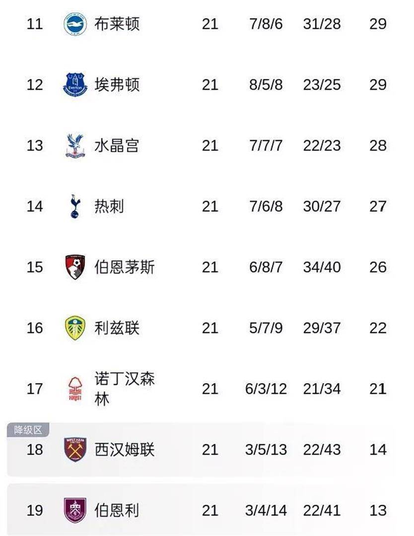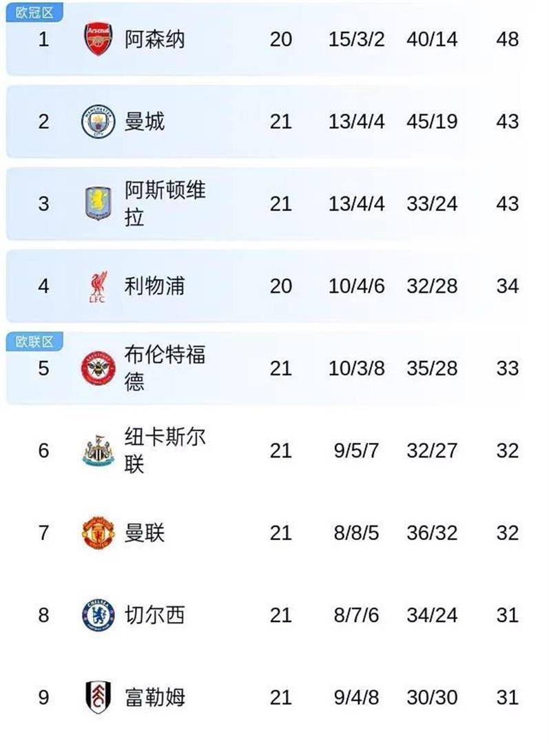 本轮结束后,阿森纳以48分领跑,少赛一场领先曼城、维拉5分。 中游球队的崛起彻底打破英超阶级固化:布伦特福德3-0大胜桑德兰后升至第5位,纽卡补时连入两球4-3绝杀利兹联,豪取三连胜后积32分位列第6。 从第4名利物浦(34分)到第15名伯恩茅斯(26分),11支球队分差仅有8分,每一场比赛都可能让欧战资格争夺重新洗牌。 保级区同样惨烈,狼队仅积7分垫底,西汉姆联和伯恩利深陷降级区,诺丁汉森林21分徘徊在安全区边缘。