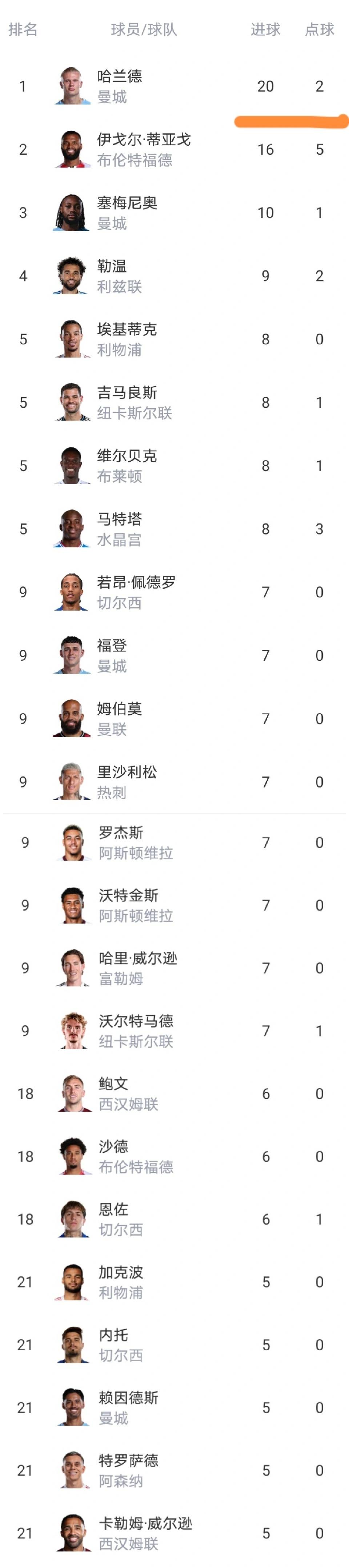 除了积分榜,射手榜的竞争也很有看点。目前整个英超只有三位球员打入了两位数的进球,这也能看出英超的防守强度有多高,想在这里轻松进球真的不容易。而曼城的哈兰德依旧是独一档的存在,在射手榜上一枝独秀,进球数遥遥领先其他球员,这种个人能力真的太无解了,妥妥的“进球机器”。