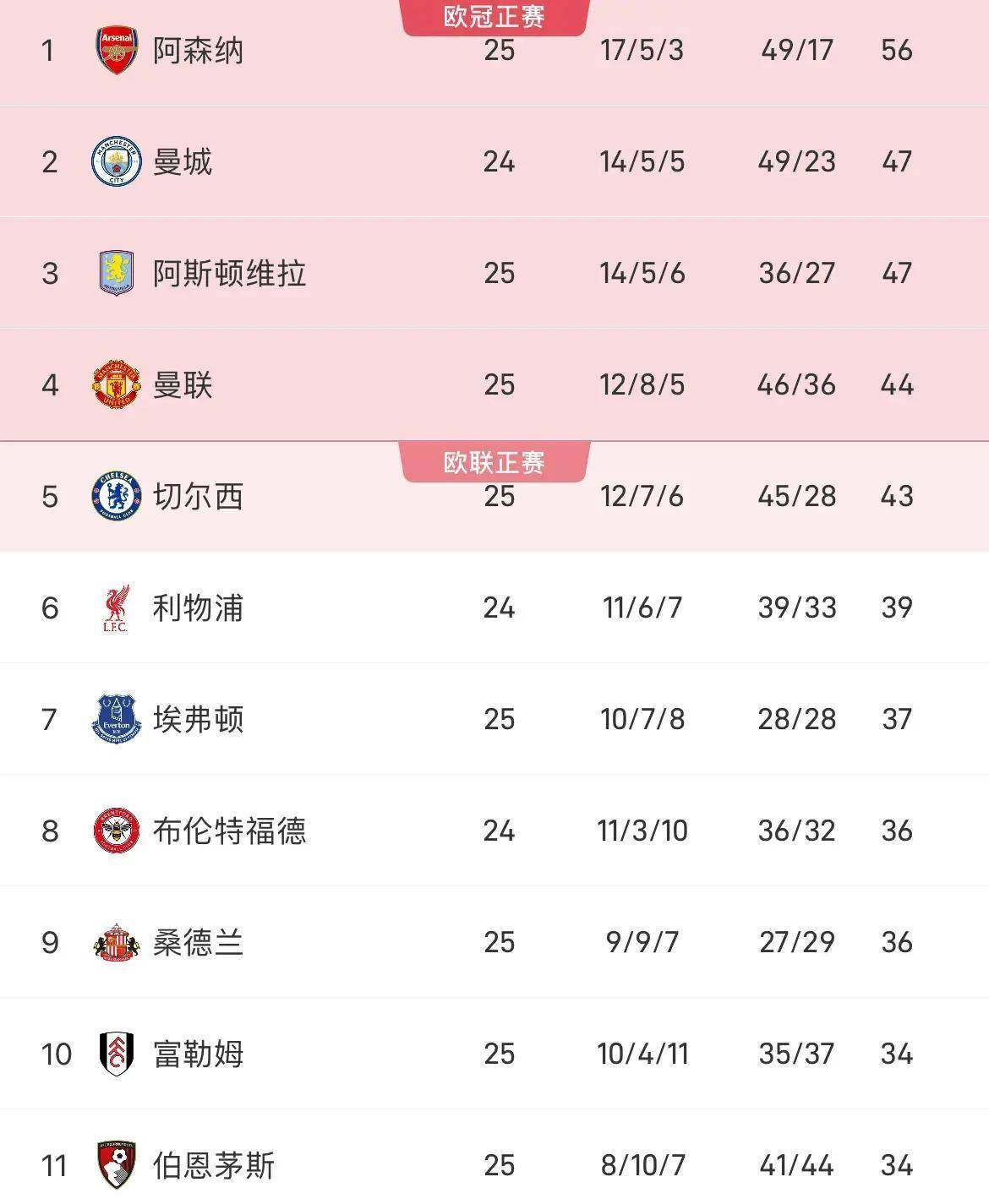 阿森纳以53分领跑,维拉46分占据前列,切尔西积40分位居前五,伯恩茅斯33分排在中游,而狼队只有8分,成为异类。