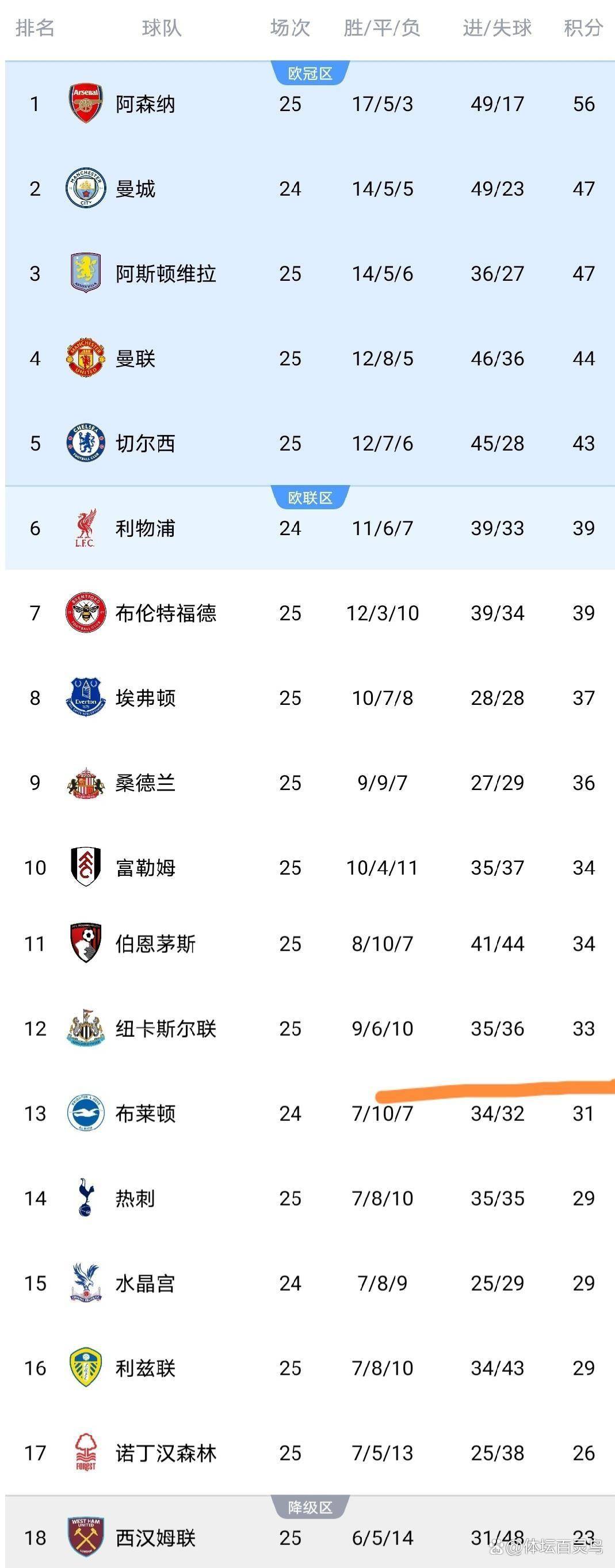 英超直播,英超赛程,英超积分榜,英超比分预测,曼联利物浦直播/覆盖2025年英超联赛所有比赛,提供免费高清中文直播入口、最新赛程安排、实时积分榜、比分预测与波胆分析,聚焦曼联、利物浦、曼城、阿森纳等豪门动态。英超第25轮的战火刚刚熄灭,积分榜就迎来了一次剧烈震动。 最核心的剧情就两条:阿森纳把领先优势扩大到9分,冠军宝座坐得越发稳当;而曼联和切尔西之间,就只差了那么区区1分,争四大战已经进入贴身肉搏的刺刀见红阶段。 垫底的狼队,眼看着就要跟英超说再见了。