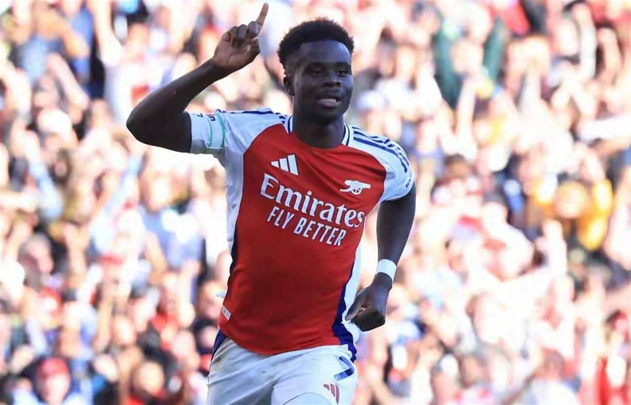 剧本的开头确实按人们预想的来了,而且来得特别快。 比赛才踢到第5分钟,阿森纳前场左侧组织进攻,德克兰·赖斯起脚传中,球划出一道弧线飞向小禁区。 狼队的防守球员集体冒顶,眼睁睁看着布卡约·萨卡从后点插上,一个俯身冲顶,皮球应声入网。 1-0,客场作战的阿森纳取得了梦幻开局。 萨卡也打破了个人长达14场的英超进球荒。