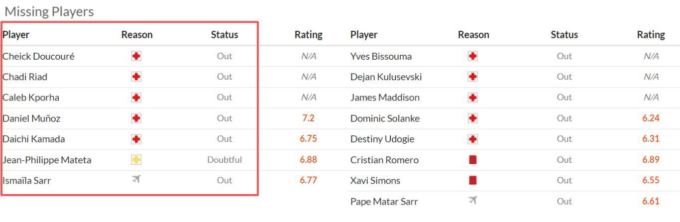 这场比赛,本就缺少前锋萨尔(非洲杯)、中场镰田大地、杜库雷和翼卫穆尼奥斯的他们,周中又伤了前锋恩凯迪亚和后卫理查兹,后者脚部缝了几针,需临场待定。这两年什么比赛都要打的中锋马特塔,近期一直带着膝伤在作战,因为他的位置无人能顶,状态下滑也是必然的,数据不会说谎,虽然他本赛季英超打入7球的效率不差,但最近三线贡献了。