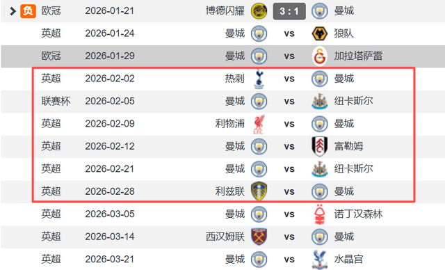 曼城1-3输给博德闪耀之后,曼城在欧冠的排名已经掉至第七,身后的球队对前八直接晋级的名额都虎视眈眈,即使排名第十五的巴萨只要本轮欧冠赢球,排名基本上就能超越曼城。若曼城在欧冠联赛阶段无缘前八的线月份的赛程就会变得非常密集,因为要踢欧冠晋级附加赛。