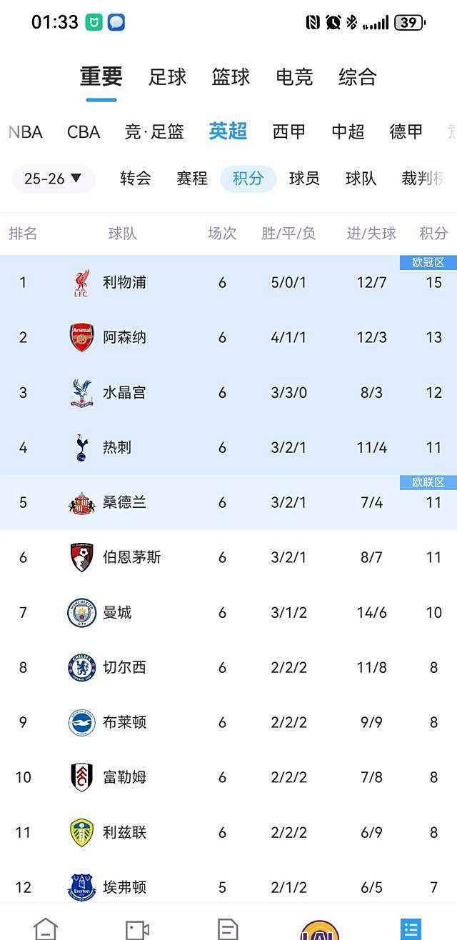 英超直播,英超赛程,英超积分榜,英超比分预测,曼联利物浦直播/覆盖2025年英超联赛所有比赛,提供免费高清中文直播入口、最新赛程安排、实时积分榜、比分预测与波胆分析,聚焦曼联、利物浦、曼城、阿森纳等豪门动态。北京时间9月28日晚,英超第6轮持续进行,阿森纳客场对阵纽卡斯尔联。在比赛的最后阶段,梅里诺和加布里埃尔相继进球,帮助阿森纳2-1逆转对手,取得连续5场不败的战绩,将英超联赛排名提升至第2位。另一场比赛中,阿斯顿维拉经过沃特金斯、迈金和布恩迪亚的进球,主场3-1击败富勒姆,取得本赛季英超首胜,英超最新排名升至第16位。