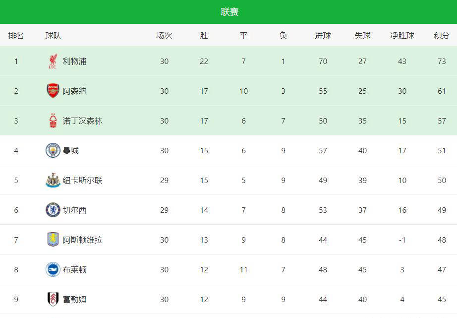 英超直播,英超赛程,英超积分榜,英超比分预测,曼联利物浦直播/覆盖2025年英超联赛所有比赛,提供免费高清中文直播入口、最新赛程安排、实时积分榜、比分预测与波胆分析,聚焦曼联、利物浦、曼城、阿森纳等豪门动态。北京时间4月3日凌晨,英超联赛第30轮6场比赛如火如荼地展开,领跑者利物浦以1-0战胜埃弗顿,取得4连胜,领先排名第二的阿森纳整整12分,让阿尔特塔感到十分绝望。卫冕冠军曼城在主场以2-0击败上赛季升班马莱斯特城,冲至积分榜前四,暂时松了口气。反观范尼的球队看来接下来可能将降级至英冠联赛,目前他们已直线俯冲至倒数第二位。同时,阿斯顿维拉在3-0完胜布莱顿后取得两连胜,上升至积分榜第七位,仍然有机会争夺下赛季欧冠资格。而尤为引人注目的是,英超联赛争夺前四的五支球队之间仅相差4分,竞争之激烈可见一斑。