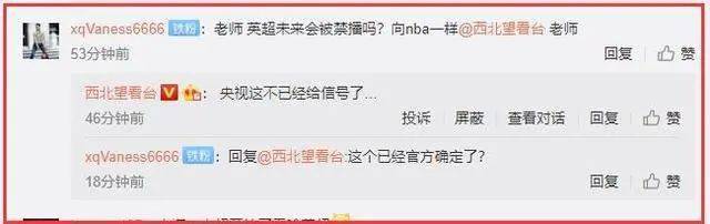 而在《西北望看台》发布消息后的评论区里,有网友留言提问英超未来是否会被禁播,像NBA一样?《西北望看台》回复道:央视这不已经给信号了……!言下之意,央视已经是在释放禁播英超的信号!