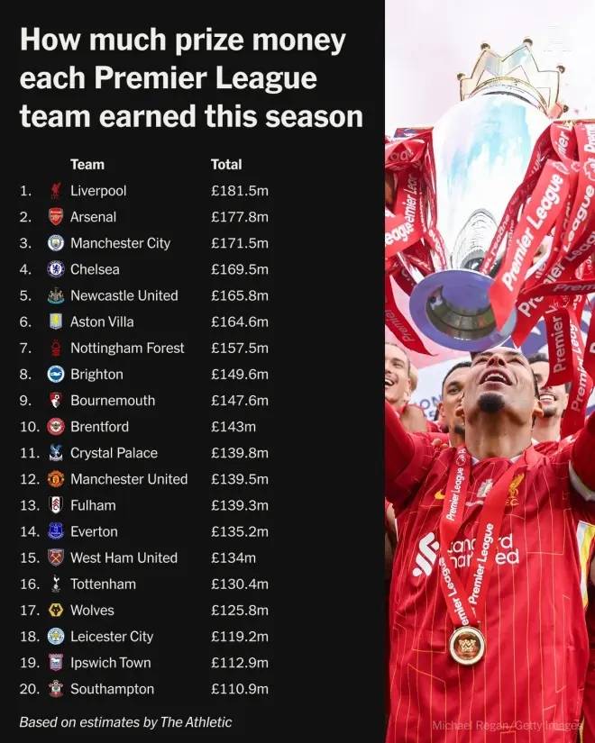 英超的转播收入分配,堪称“集体富裕”的典范。上赛季利物浦以1.815亿英镑高居英超转播收入榜首,阿森纳以1.778亿英镑紧随其后,曼城、切尔西也收获接近1.7亿英镑的丰厚回报。即便是排名第12位的曼联,转播收入也达到1.395亿英镑,而上赛季垫底降级的南安普顿,转播收入同样突破1.1亿英镑。这组数据的背后,是英超坚持多年的“50:25:25”分配原则——50%的收入由20家球队平分,25%按转播场次分配,25%依据联赛排名分配。这种相对均衡的模式,让即便是保级球队也能获得稳定且可观的收入,为联赛整体竞争力的提升奠定了经济基础。