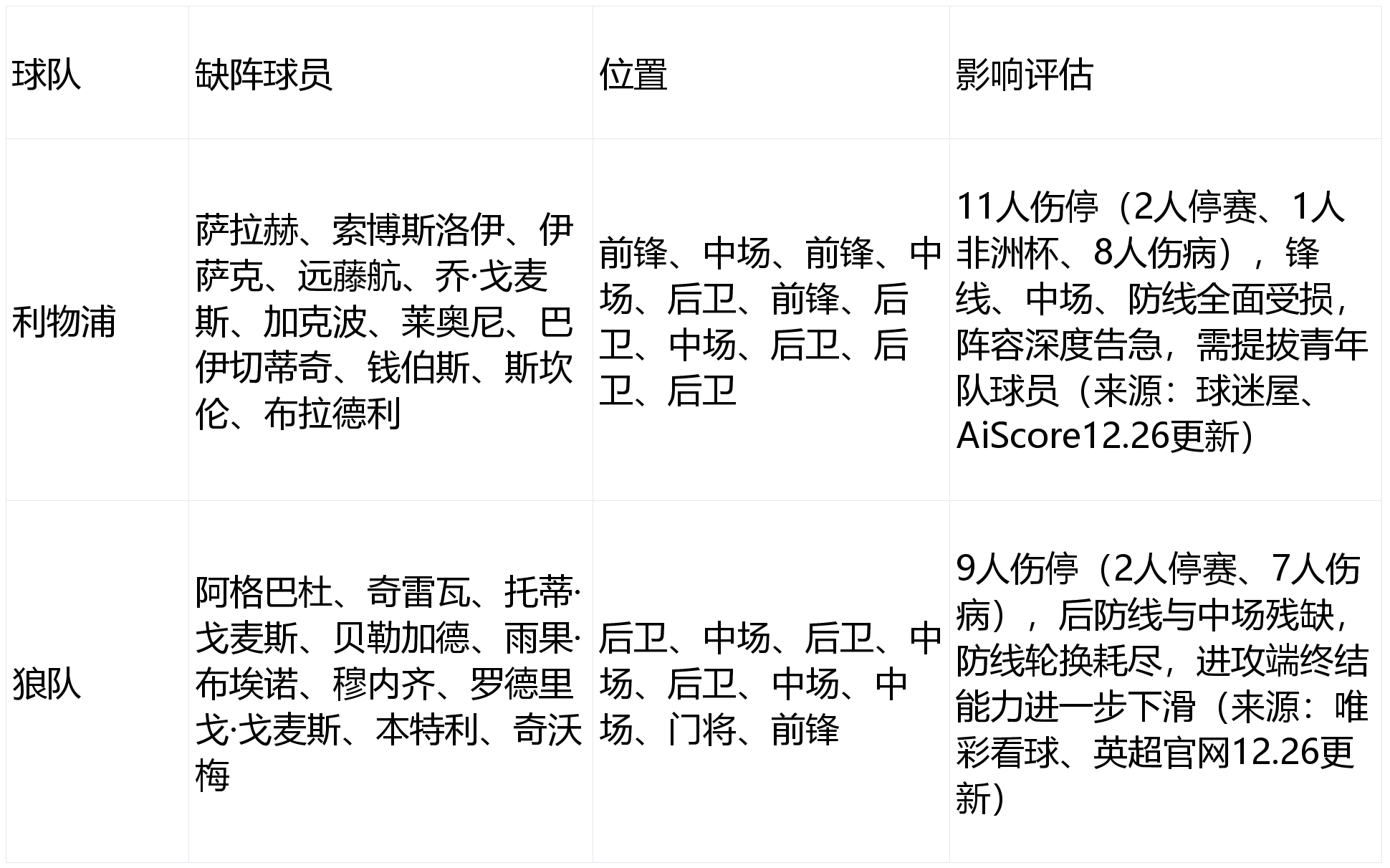 注:两队均遭遇大规模伤停,利物浦核心战力受损但整体框架仍在,狼队则攻防体系近乎崩塌;临场比拼的不仅是实力,更是阵容轮换与心态调整能力,具体首发阵容以赛前官方公布为准。