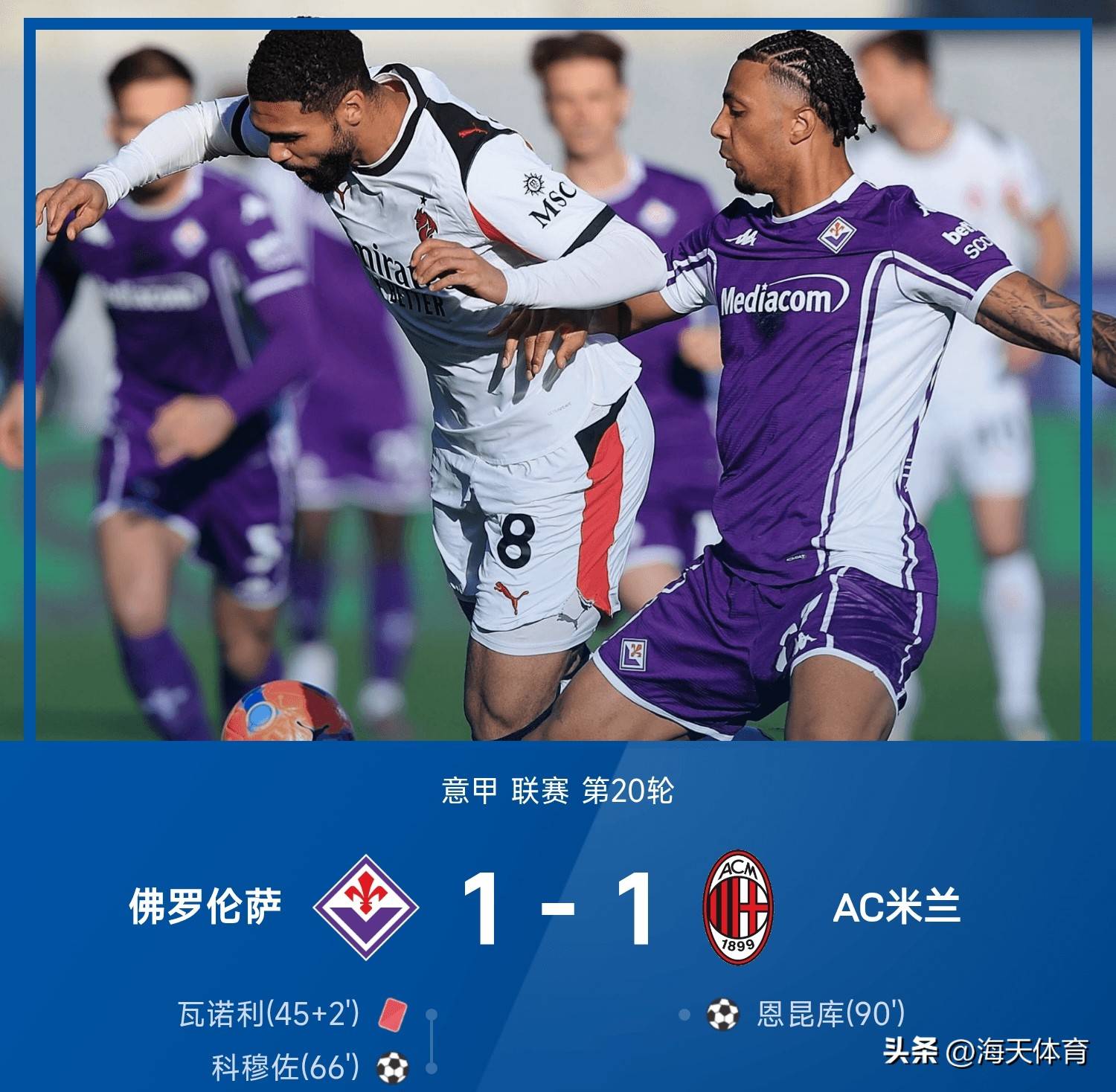 全场比赛:第66分钟,佛罗伦萨左侧角球开出,科穆佐头球攻门击中立柱弹进球门!佛罗伦萨1-0AC米兰,第90分钟,福法纳送直塞,恩昆库禁区内右侧抽射破门!AC米兰1-1扳平佛罗伦萨,